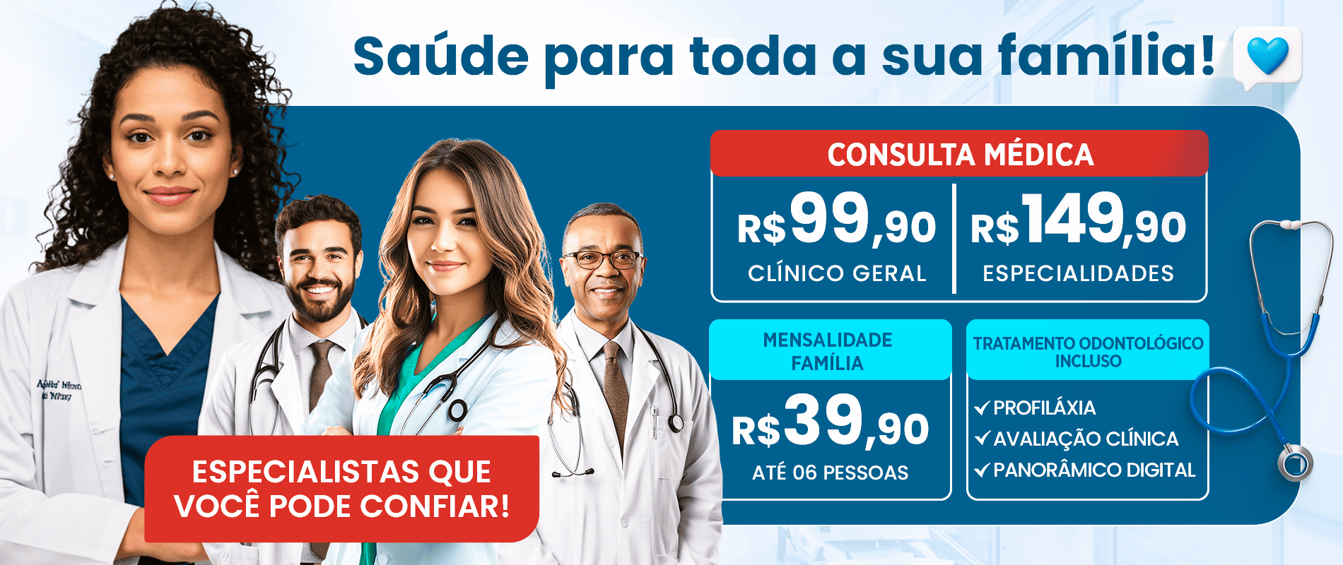 Por apenas R$ 39,90/mês, você e sua família tem descontos em consulta médica e odontológica. Descontos até em 50% em nossos parceiros.